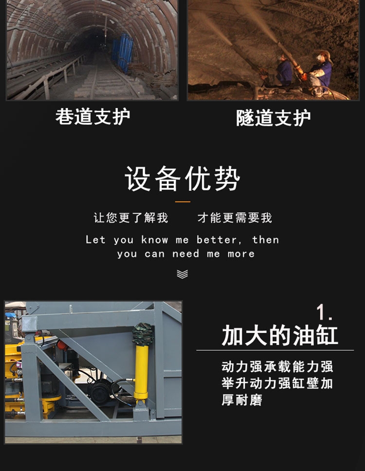 液压湿喷机产品特点 液压湿喷机结构简单,适应性强。泵送压力高,输送距离远。高效率:输送排量大,综合工效高。高性能:喷射混凝土性能高,密实、匀质、高强度。高可靠性:关键件采用国内知名品牌保证设备高可靠性。速凝剂添加与控制技术:采用知名气动计量泵,计量准确,雾化射流与喷嘴料流混合使得速凝剂与混凝土混合均匀。