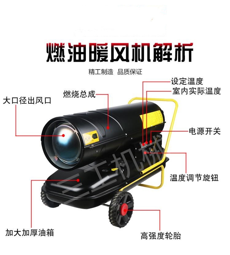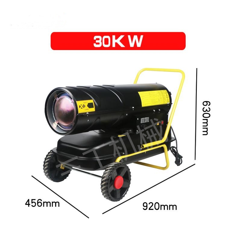 暖风机是由通风机,电动机及散热器组合而成的联合机组。工业燃油暖风机适用于空气允许再循环的各种类型的车间厂房、孵化养殖、园艺种植、木柴烘干、室内取暖等,当空气中不含灰尘,易燃性的气体时,可作为循环空气采暖之用。燃油暖风机主要由空气加热器和风机组成,空气加热器散热,然后风机送出,使室内空气温度得以调节。空气加热器由螺旋翅片管组成,排管和热媒流通管道是整体焊接结构,暖风机的工作压力在0.7MPa以下。