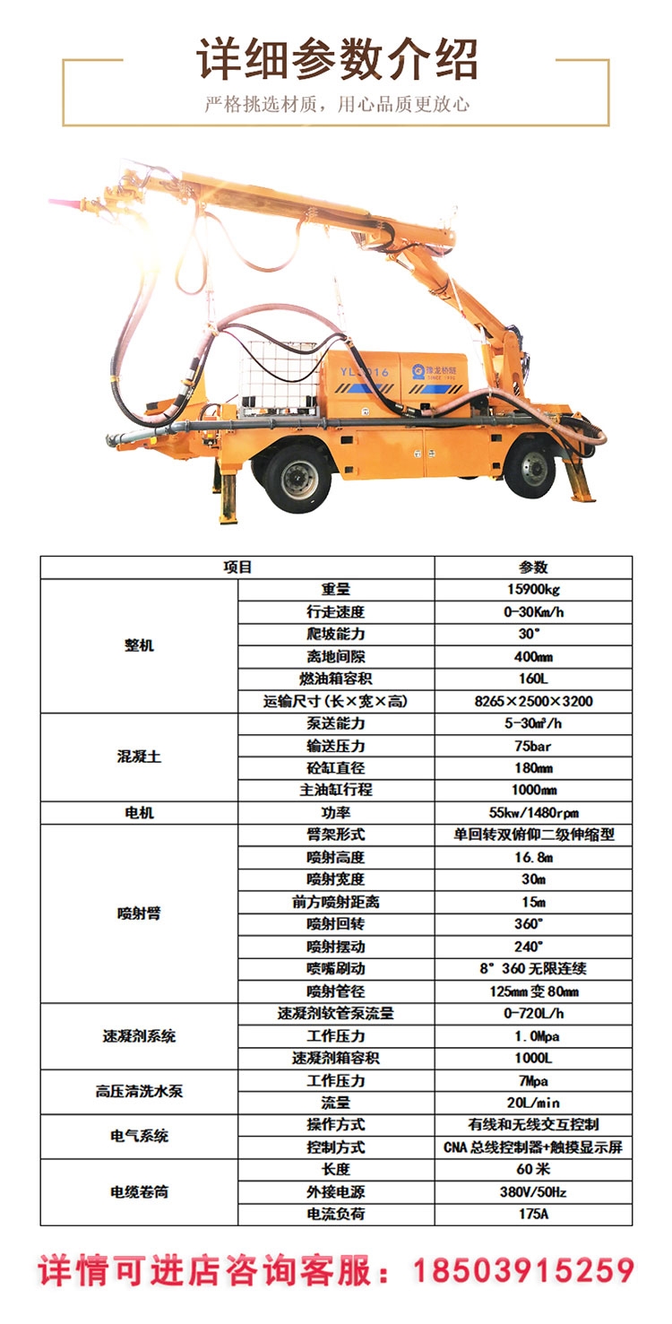 生产率高:施工效率30m/h,是普通湿喷机的3+4倍。施工好:均匀度和密实性高,回弹率低,粉尘。机械化程度高:超长距离无线遥 控操作,臂架可折叠伸缩回转,作业无盲区。适应性好!工程车底盘结构,机械手高度16米,宽度30米,喷头回转角度360°,可 适应多种施工。 3016湿喷机械手 湿喷台车 液压湿喷机械手设备价格3016湿喷机械手 湿喷台车 液压湿喷机械手设备价格。
