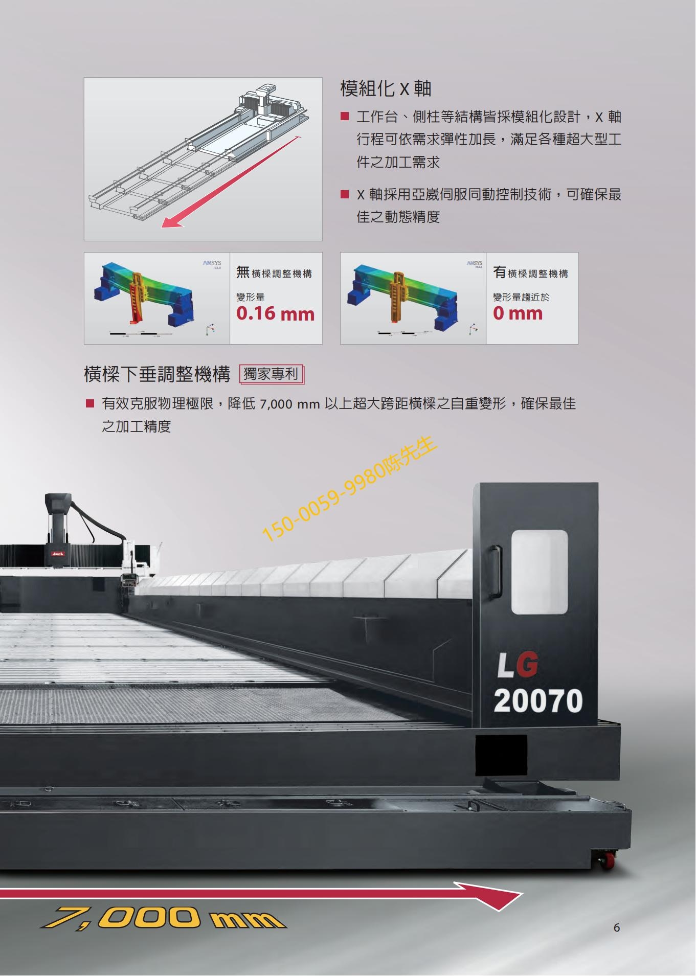 結合模組化設計理念與獨家技術,提供 LG 系列商品化超大型加工機之能力,並領先台灣業界推出 7,000 mm 橫樑之超大型加工中心機「 LG-20070 」
