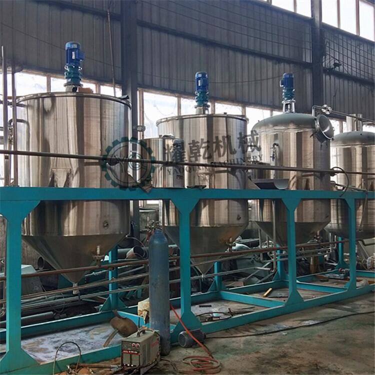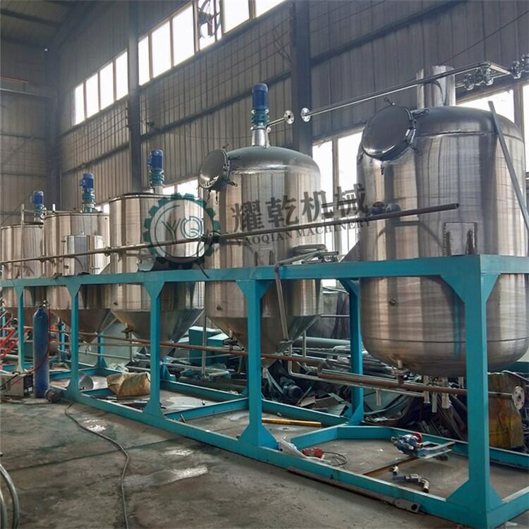 物理脱酸是在高真空条件下,通过向蒸汽中引入油脂来去除酸值、不皂化物和气味物质方法。与化学脱酸相比,该法无皂脚产生,因此油耗低,油品质量高,且操作简单,需要蒸汽、水和动力少,需要投资低,一些热敏性色素(类胡萝卜素)和臭味物质也随蒸汽汽提除去。与碱炼脱酸相比,物理脱酸具有产量大、无皂脚、减少溢流和减少环境污染的优点。但也存在一些不足,如原油预处理要求严格,热敏棉籽油不适用,高温下油产生的聚合物和反式酸等。河南耀乾年产五十万吨精炼油生产线 食用油压榨精炼设备 油脂提炼机