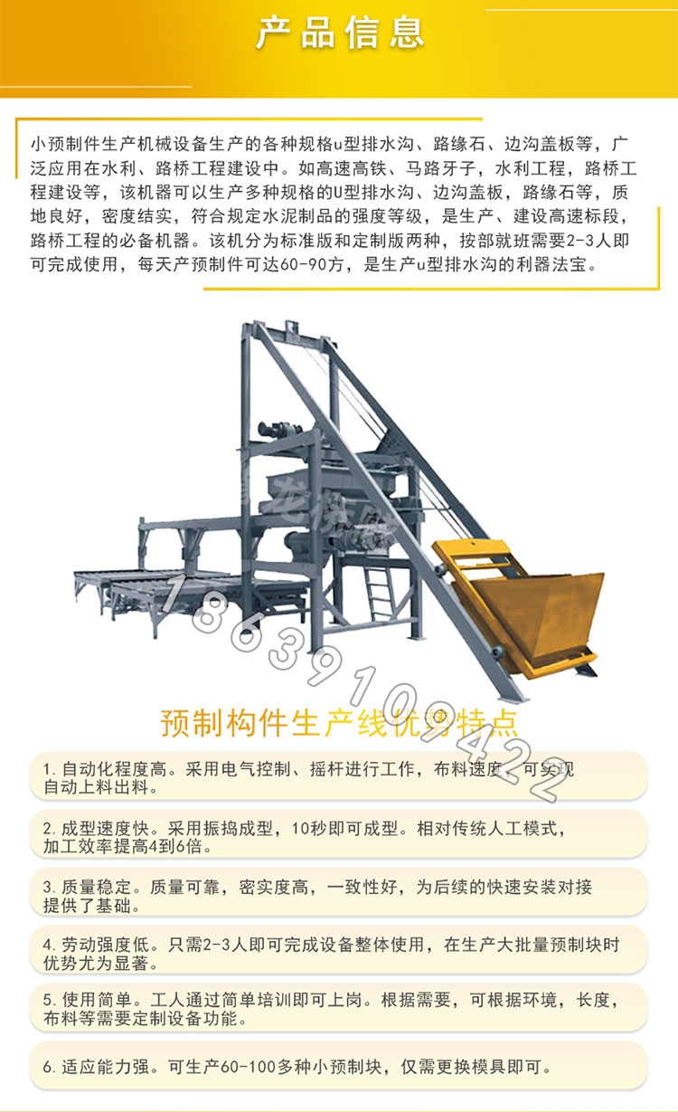 按照规划的产能目标进行设备综合参数的测算、比较及组合,终形成一套技术先进、可靠、节能、运行成本低的设备选型方案;在人员配置方面:根据产能规划及产品类别,合理测算出日产能计划,按照人均产能测算出各工种的人数概算;在产能规划方面:根据构件厂所在地预制构件市场占有率情况、发展速度以及盈亏平衡点,做好需求,在现有的厂区地域情况下合理规划出近期及远期产能,并以此为准来进行其他方面设计。小型预制构件生产线 小型预制块振捣机械 铁路护坡预制块的设备。