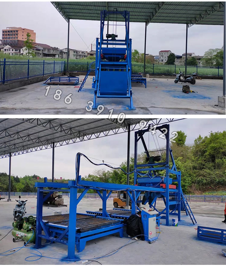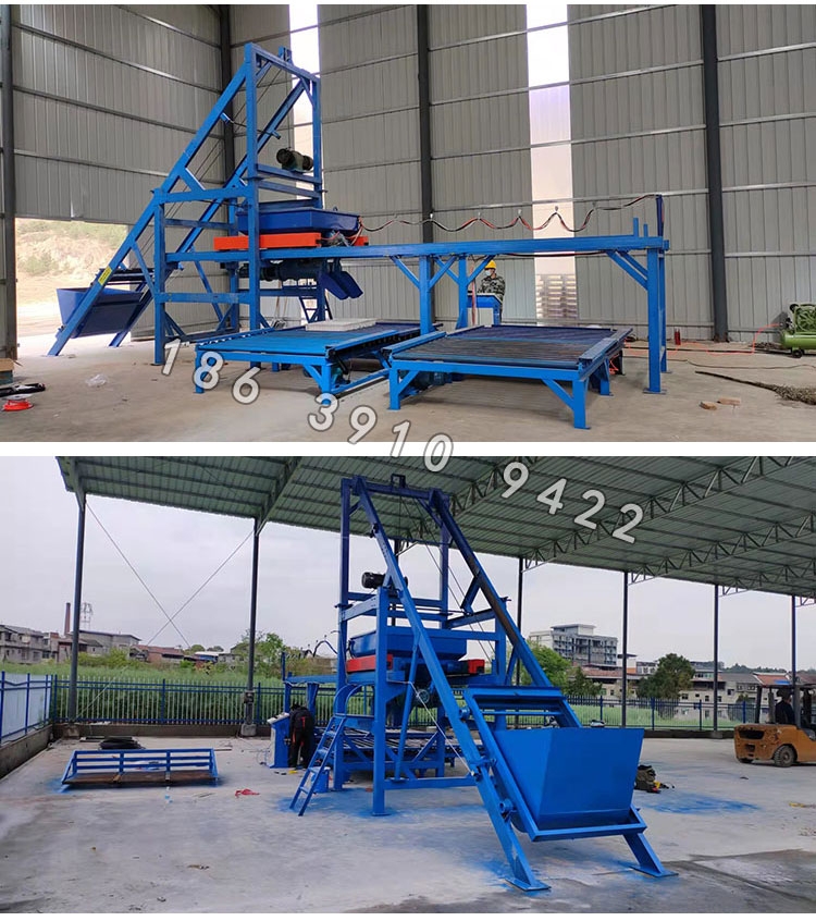 小型预制构件生产线 骨架拱圈预制设备 混凝土预制块生产设备 开始布料,一边布料一边振动,这样不需要人工摊平,设定振动时间,振动结束,平台开始传送,下一个模具又会传到布料机下,这样循环工作;振动平台设有吸音装置和垃圾回收装置,在振动时两人可以正常对话。