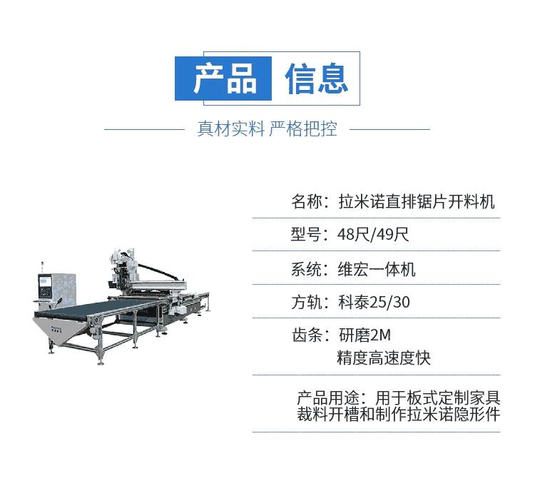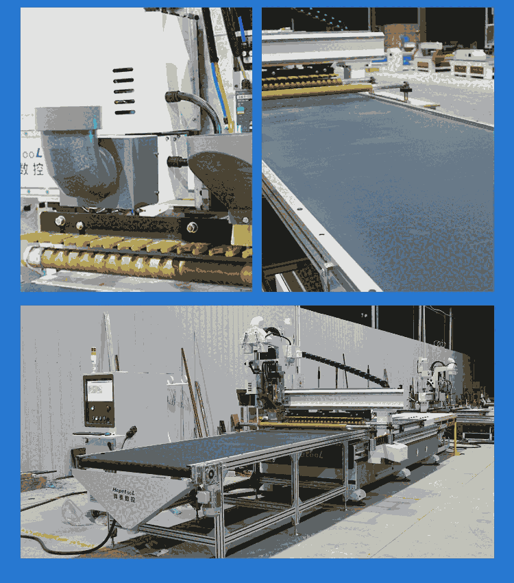 直排加工中心主要用于板式家具柜体以及门板的加工生产;可以钻孔、开槽与切割下料的加工,像市面上常见的板式家具二合一、三合一连接件,隐形连接件的板式家具都可以加工。而且还可以实现雕刻门板,是一款多功能的能够多样化加工的数控开料机机型。