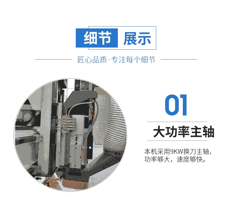 这款开料机机头配备9.0KW大功率风冷换刀主轴和6把的直排式刀库,