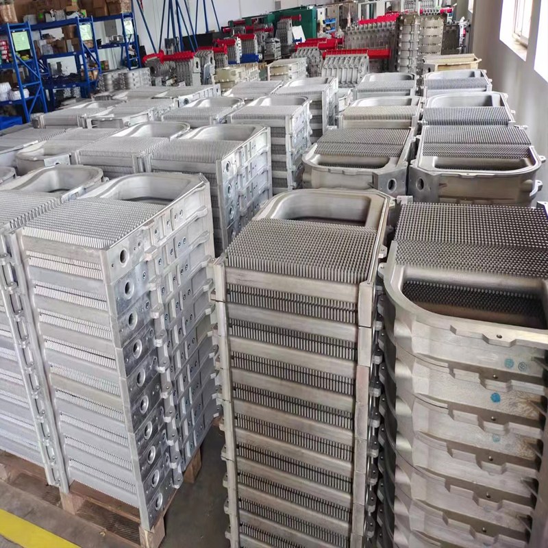 热交换采用铸铝片组合而成,优化水路结构,增加了高低吸热柱,水路走中间一体铸造水道,两侧为吸热烟气通道,每片的吸热通道采用组合式,通过耐高温胶垫、固定螺丝等紧固,下部设置不锈钢烟箱及冷凝箱,烟箱与炉体为分体式组合式;