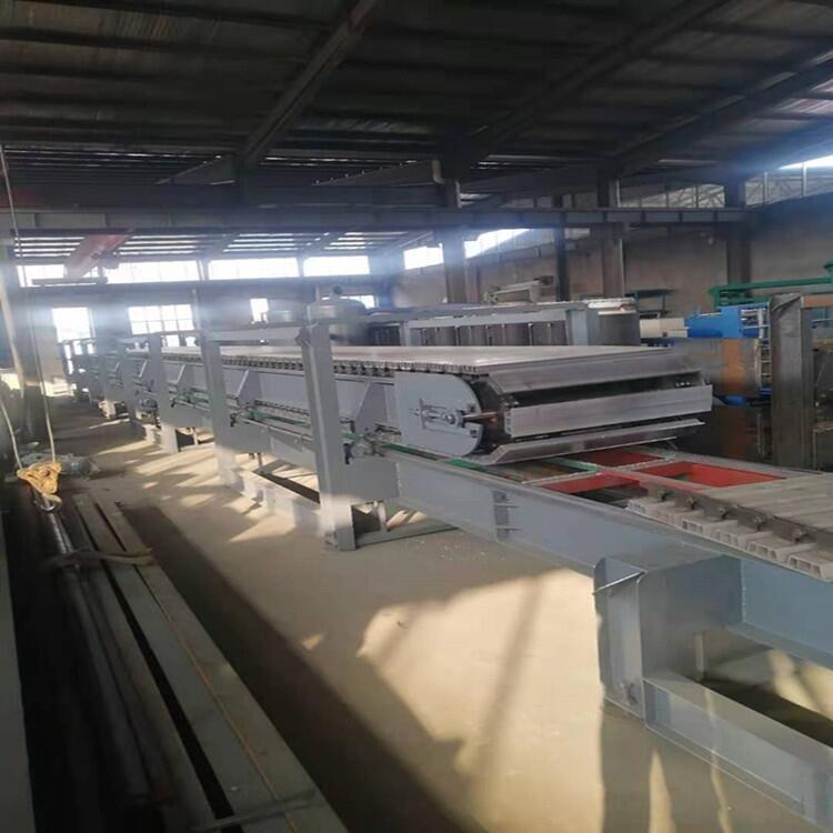 铝板样式为1355*200,装有轴承,通过拖链形式,利用5.5kw电机进行传动,用铝板传动优点在于:1、铝板的导热系数高,对于冬季砂浆纸岩棉复合板板材里的聚氨酯的发泡,板材的粘接能力都有很好的提升。