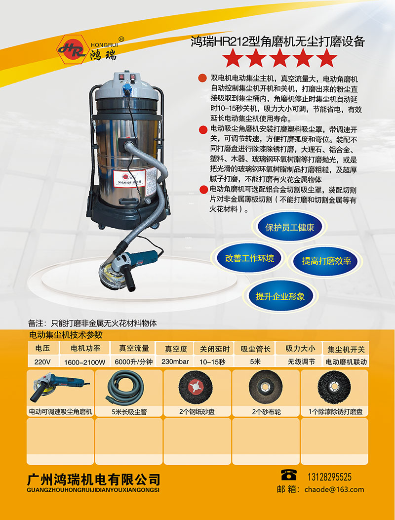 1、电动角磨机打磨时,自动控制电动集尘主机开机吸尘,把打磨出来的粉尘吸取到集尘桶内,没有粉尘飞散,确保操作人员的身体健康!