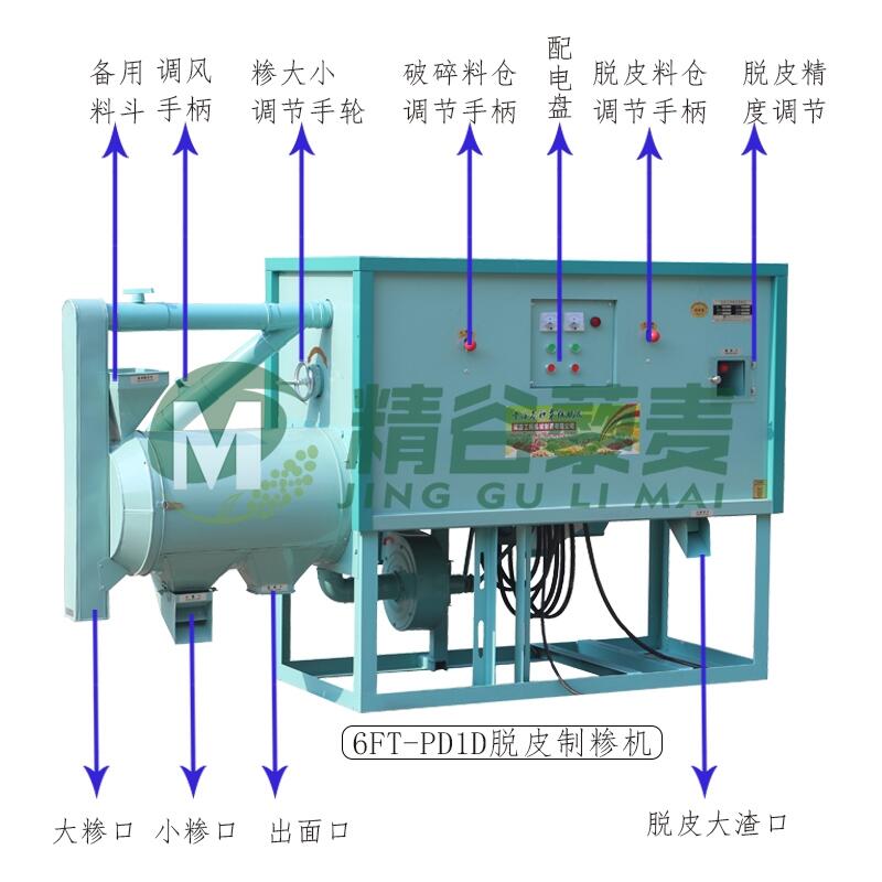 将原粮倒入提升机进料斗内,物料自动输送提升到脱皮进料仓内,经脱皮抛光后的玉米大糁(玉米大碴子、玉米大渣)再经提升机提升到破碎制糁机料仓内,破碎之后的糁、粉由圆筒分级筛分出大糁、小糁及粉后即可打包。