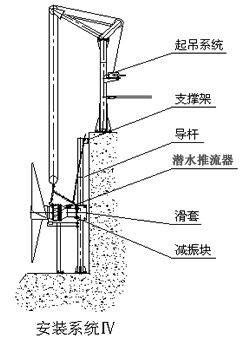 潜水推流器应为成套装置,包括安装系统和提升装置。安装系统应由方钢导杆和顶部部和底部支座等组成,可自由调整推流器的提升和下降,并可在不排空水池的情况下拆卸和安装推流器。推流器装在一个可在导杆上滑动的支架上作为一个整体,该支架必须能够承受推流器的整个重量和造成的所有推力。提升装置应为可移动式,起吊架的固定装置不可安装在池壁上或池测工作平台上,应安装在安装系统的顶部支座上,应含专用起吊钩、提升链和葫芦。每台推流器配备一套起吊架。
