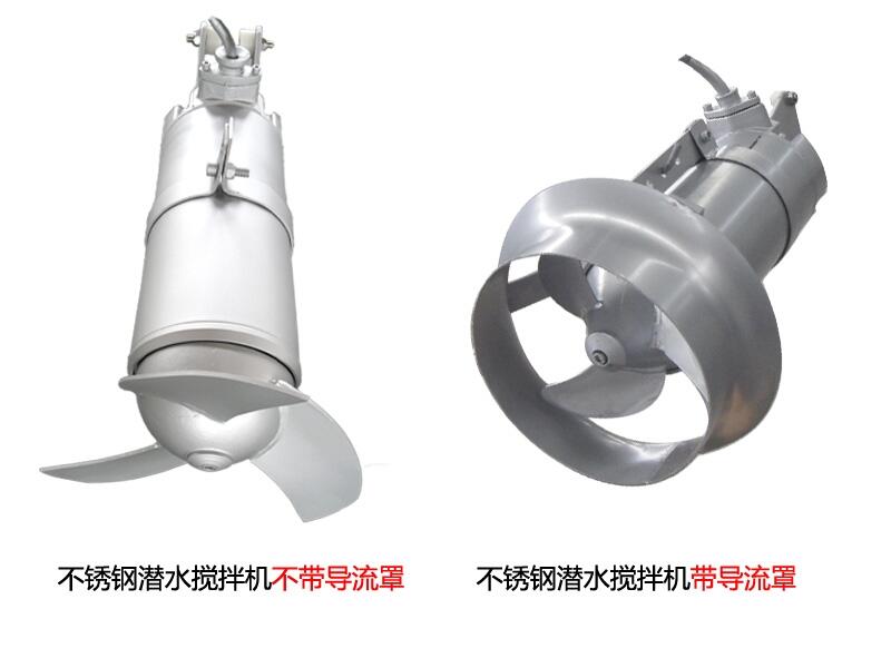 江苏杜安环保不锈钢潜水搅拌机一般配制导流罩以增加轴向流动并减少径向流动,减少叶轮振动,增加运转的平稳性。而低速推流型潜水搅拌机不配制导流罩。