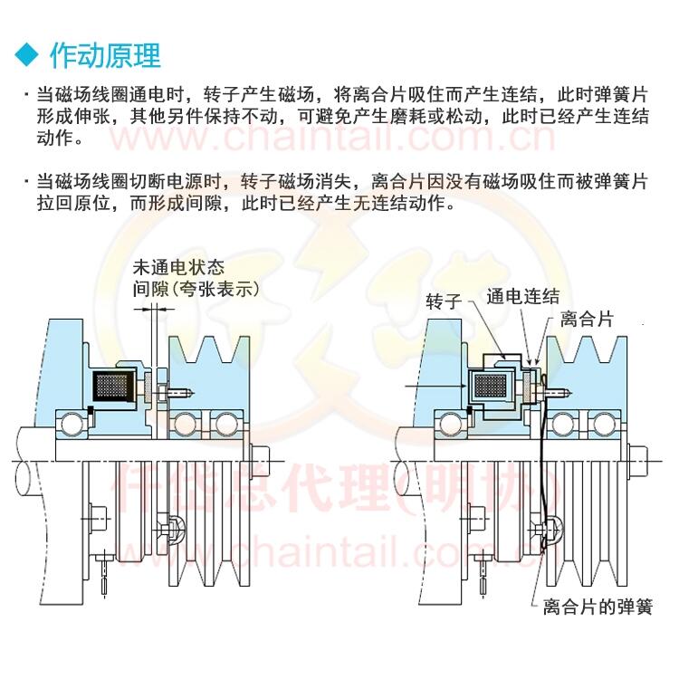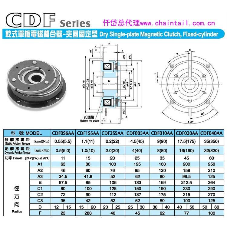 台湾仟岱电磁离合器CDF040AC,工作电压DC24V,扭力350牛米,工作间隙0.4-0.5MM,轴孔50MM,可搭配铝座对轴安装,也可搭配皮带轮等部件同轴安装。由于电磁离合器属于易损件,使用时间长了会有所磨耗,需要定期检查维护。