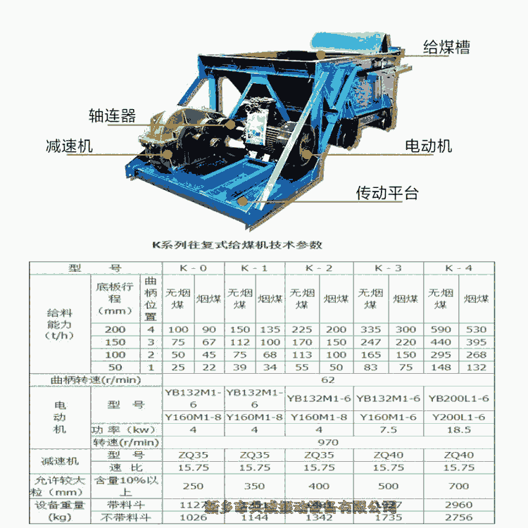 往复式给煤机主要由仓口漏斗、箱体、闸门、底板、托辊、驱动装置等组成。托辊用于支承底板,底板通过驱动装置驱动并在托辊上作有规律的往复直线运动,底板顺煤流方向的运动称为正行,底板逆煤流方向的运动称为逆行。当底板正行时将煤仓和给煤机箱体内的煤输送到箱体的前端,底板逆行时,箱体内的煤被箱体后部的斜板挡住,底板与煤之间产生了相对滑动,箱体前端的煤自行落下,由于底板往复运动的结果,从而实现连续均匀的给料,这就是往复式给煤机的工作原理。
