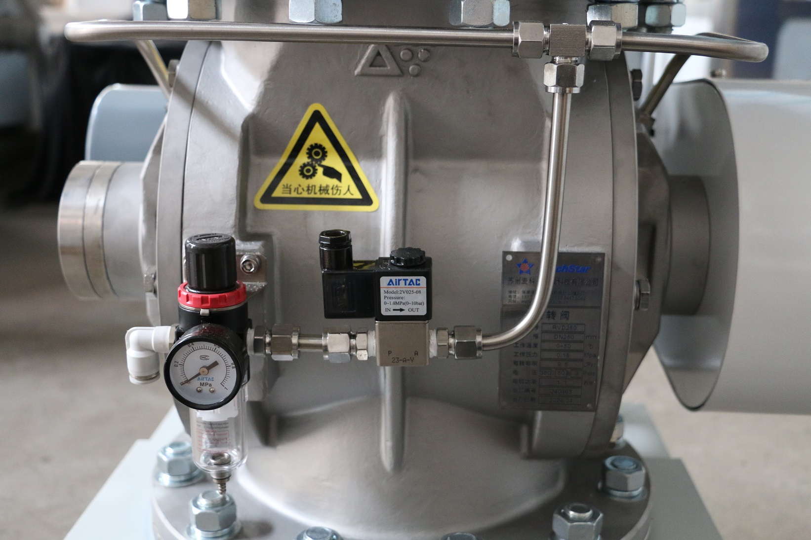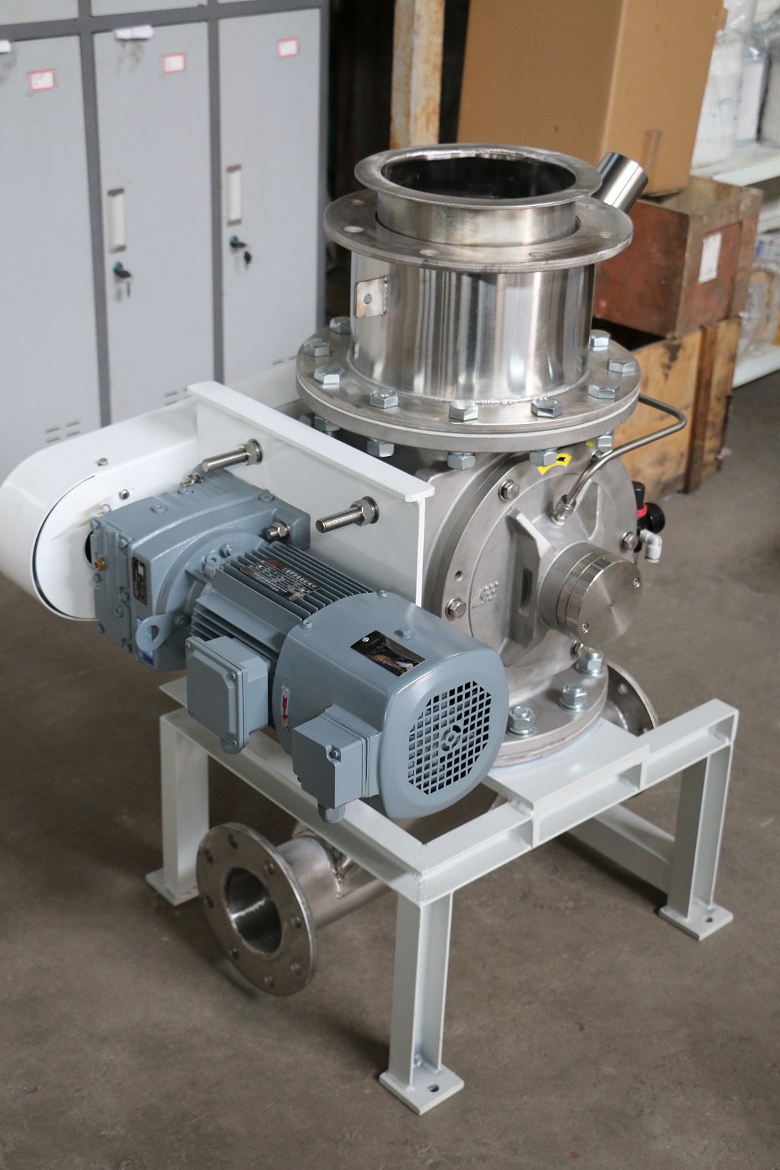 物料从上部料斗下落到星形叶片之间,然后随叶片旋转至旋转阀下部,凭借重力从出料口卸出。