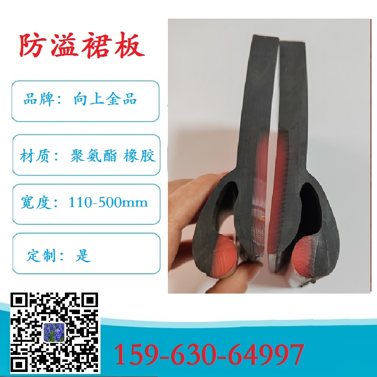 产品介绍→:防溢裙板是一种重要的密封和防护工具,主要用于输送带与导料槽之间以及缓冲床与导料槽之间的密封。它由聚氨酯和橡胶复合而成。