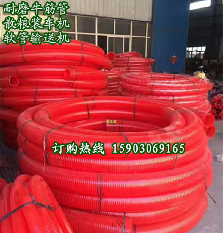 南阳用黄豆装车机 直径12公分3.5寸软管散粮水稻自吸输送倒仓平仓是种耐磨的牛筋管可弯曲可盘起省人省力携带方便适用各种粮食农作物装车、卸车、出库、入库、倒仓、平仓等,本机器是电机轴和螺旋弹簧用螺杆链接,当其启动电机后电机带动螺旋弹簧旋转,在集料口的粮食就会在旋转弹簧的作用下沿着弹簧的螺旋升角方向上升,到达出料口时由于重力作用自动卸粮