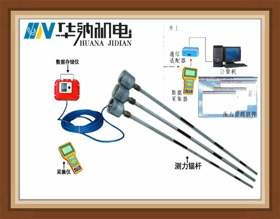 本测力锚杆属于矿山及岩土工程专用测力装置,是测定锚杆全长受力变化的监测仪器。该锚杆主要由电阻应变计(传感器)及手持采集器。固定在锚杆上的电阻应变计将感受的应力变化情况,通过手持采集器读出力值(kN)。其特点是体积小、重量轻、性能稳定、安装携带方便。