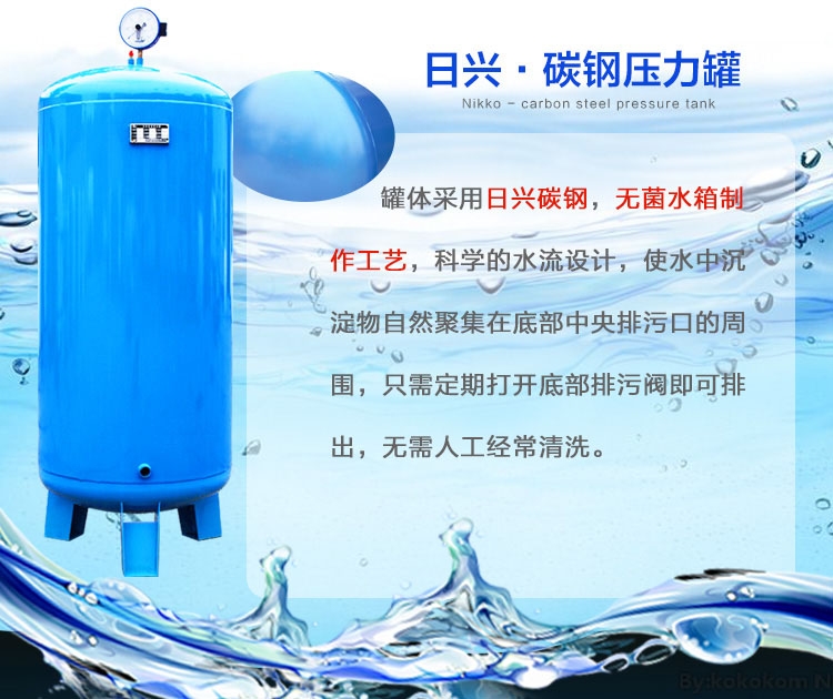 压力罐:无塔供水器采用动力设备汲取水到无塔供水容器内,利用空气压缩的原理,形成自然压力,从而实现水资源全封闭存储,增压,输送等全自动供水功能,具有全自动控制,可移动无污染,造价低,寿命长等优势,完全替代了成本高昂,大兴土木的高价水塔和敞开式房顶水塔,实现了供水自动化,智能化。
