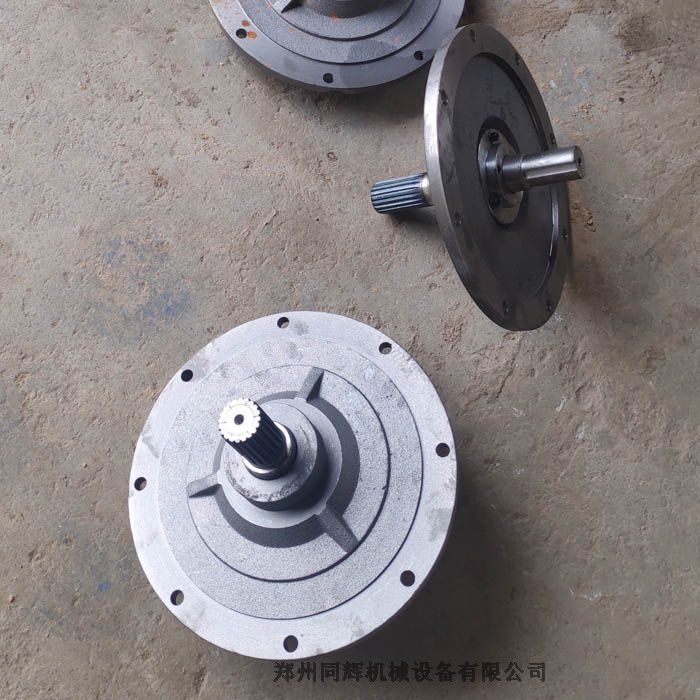 325螺旋输送机动力头 花键轴头28齿传动件 绞龙联轴器配件。螺旋输送机动力头,又称为动力尾盘,是皮带轮式螺旋输送机减速器的重要组成部分。其结构为,法兰盘里面安装有优质耐磨轴承,轴承上贯穿一个传动轴,其一端为圆柱轴头带键槽用来和外面的皮带轮相连接,另外一端为花键轴头,用来和绞龙管芯叶片上的花键套配合连接,从而达到转速和传动扭矩。其中165/219/273螺旋绞龙动力头轴头直径35mm,B型双槽皮带轮直径275mm,轴孔35mm,325螺旋动力头齿数28齿。