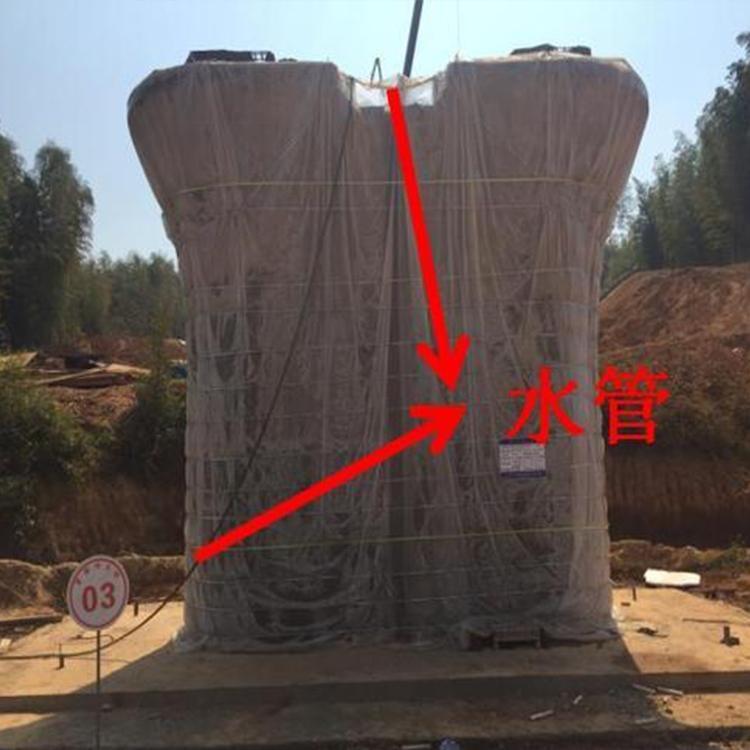 双线矩形异形墩,框架墩等923个墩台,特大桥预制箱梁829孔,现浇箱梁71孔,连续梁12孔,2桥梁工程成套自动喷淋养护工艺2.1承台自动喷淋养护工艺传统承台养护采取覆盖土工布,人工浇水的方式,由于受到墩身预埋筋及内架的影响。土工布覆盖不严容易出现死角,也存在不及时的情况,为此,施工中尝试使用了自动摇摆喷头的养护方式,将承台顶面用土工布覆盖,在承台顶面布设喷淋管道,安装2-3个摇摆式喷头,喷淋范围相互交叉重叠,定时定量喷淋。以确保整个承台顶面处于润湿养护状态,这样既保证了养护的及时性和性,又节约了人工成本,2.2墩身[穿衣戴帽"自动喷淋养护工艺采用[穿衣戴帽"自动喷淋养护技术进行墩身养护,墩身浇筑.