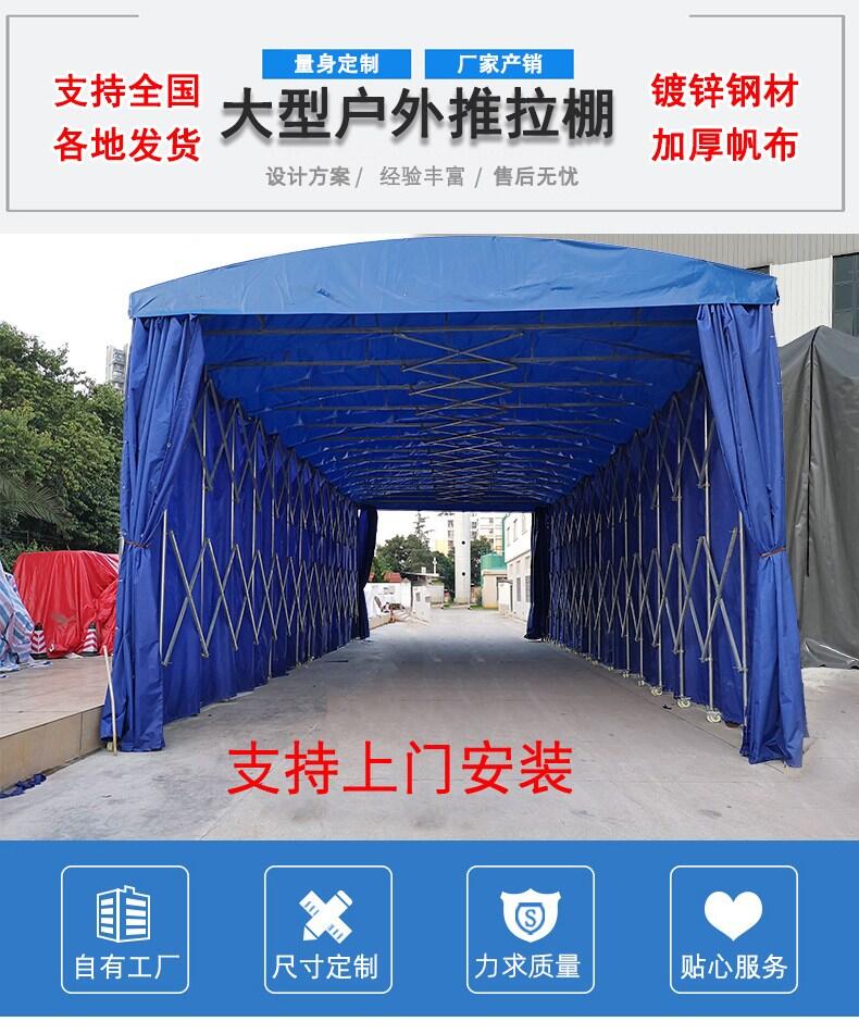 汽车户外遮阳棚 本身的一个非常大的优点就是移动便利、可推拉,毕竟在很多场合下我们对于推拉伸缩雨棚的需求都是短暂性的,比如突然下雨的时候,露天大排档有食客,或者厂家的产品无处安放的时候。可是,一旦这个需求时间过去的话,一个推拉伸缩雨棚可以会变成累赘,造成各种不方便,如占用空间,影响光线等。所以,可移动的推拉伸缩雨棚大的优点就是在有需求的时候出现,在不需要的时候收缩起来,十分人性化,便利实用。