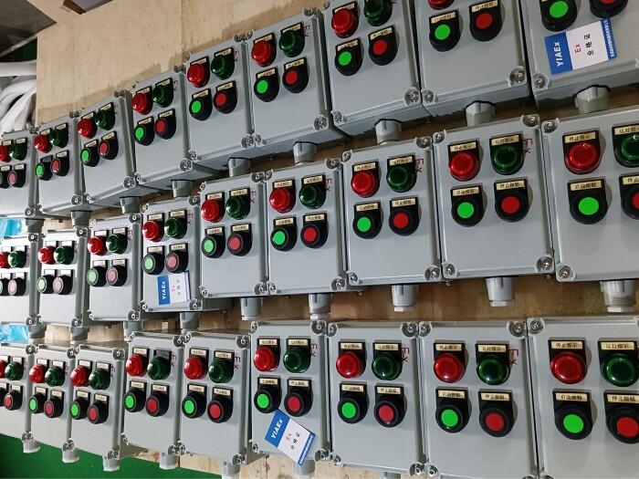 乐清益安防爆电器科技有限公司向您介绍我们的防爆机旁操作控制箱。我们将从多个角度来详细描述这个产品,帮助您了解它的特点和优势。下图这款防爆控制箱外壳尺寸为200X135X100,表面加装两个防爆按钮,两个防爆指示灯,一个防爆电位器,壁挂式安装,进出线口为G3/4,不锈钢紧固件。