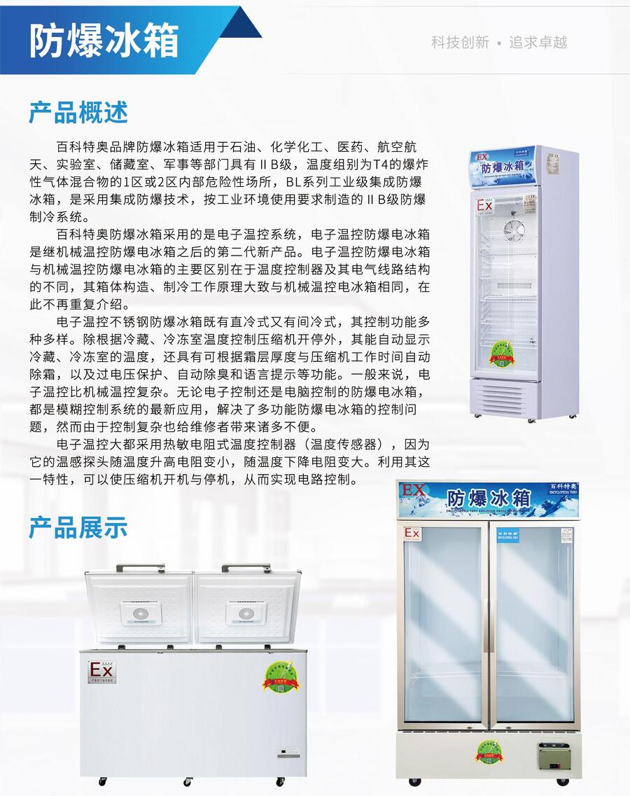 铜陵防爆冰柜,400升铜陵防爆冰箱厂家百科特奥防爆冰箱型号BL-200,BL-380,BL-560,BL-880,BL-1200。200-1200防爆冰箱定制。200升防爆冰箱,300升防爆冰箱,380升防爆冰箱,560升防爆冰箱,880升防爆冰箱,1200升防爆冰箱。杭州百科特奥防爆冰箱生产厂家有:立柜式防爆冰箱单开门/双开门、卧式防爆冰箱/冰柜、单控温防爆冰箱、双温防爆冰箱、单风冷无霜豪华型立式专用展示柜防爆冰箱(风冷无霜、带数据记录仪、数据导出USB接口)。可定制485通讯系统远程控制。http://www.ex-fbkt.com/hangzhouteao2013-ParentList-833258  百科特奥防爆冰箱厂家欢迎咨询!