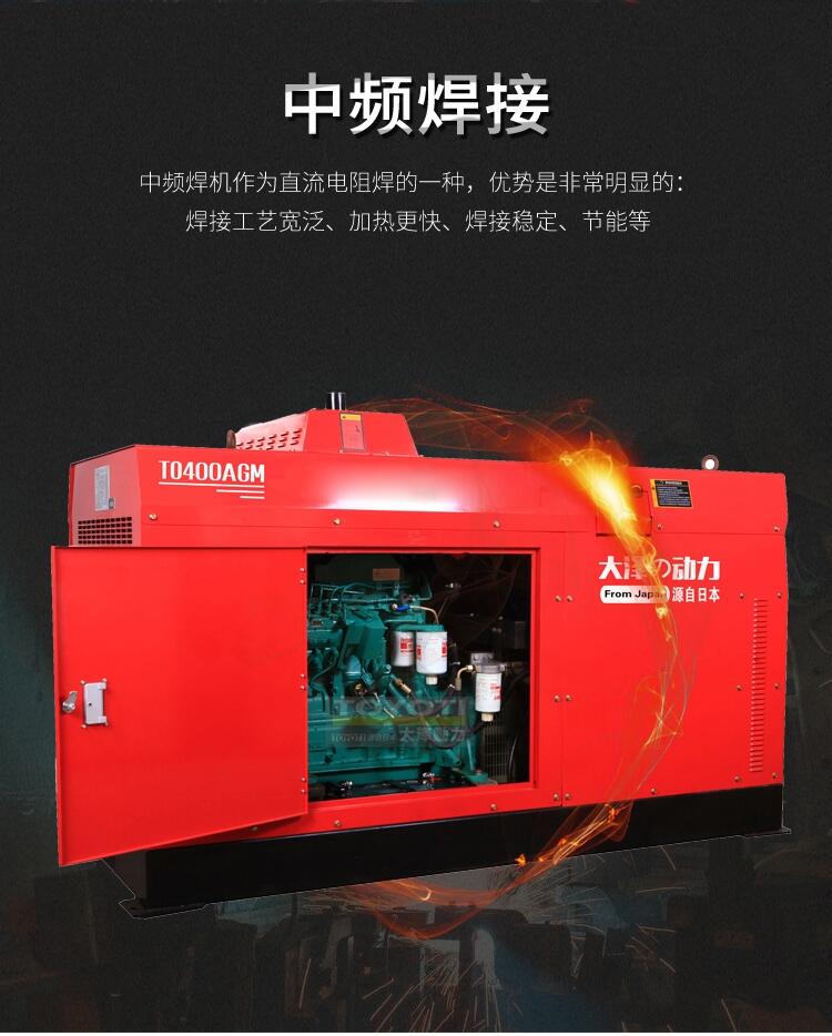 大泽500A柴油发电电焊机大泽发电焊机重量轻,便携式,手推式,功率大,无需固定电源,此款产品的问世对那些经常野外作业、用电不便、山上施工、开发乡里、管道电焊、停电应急电焊、工程施工等用户使用。