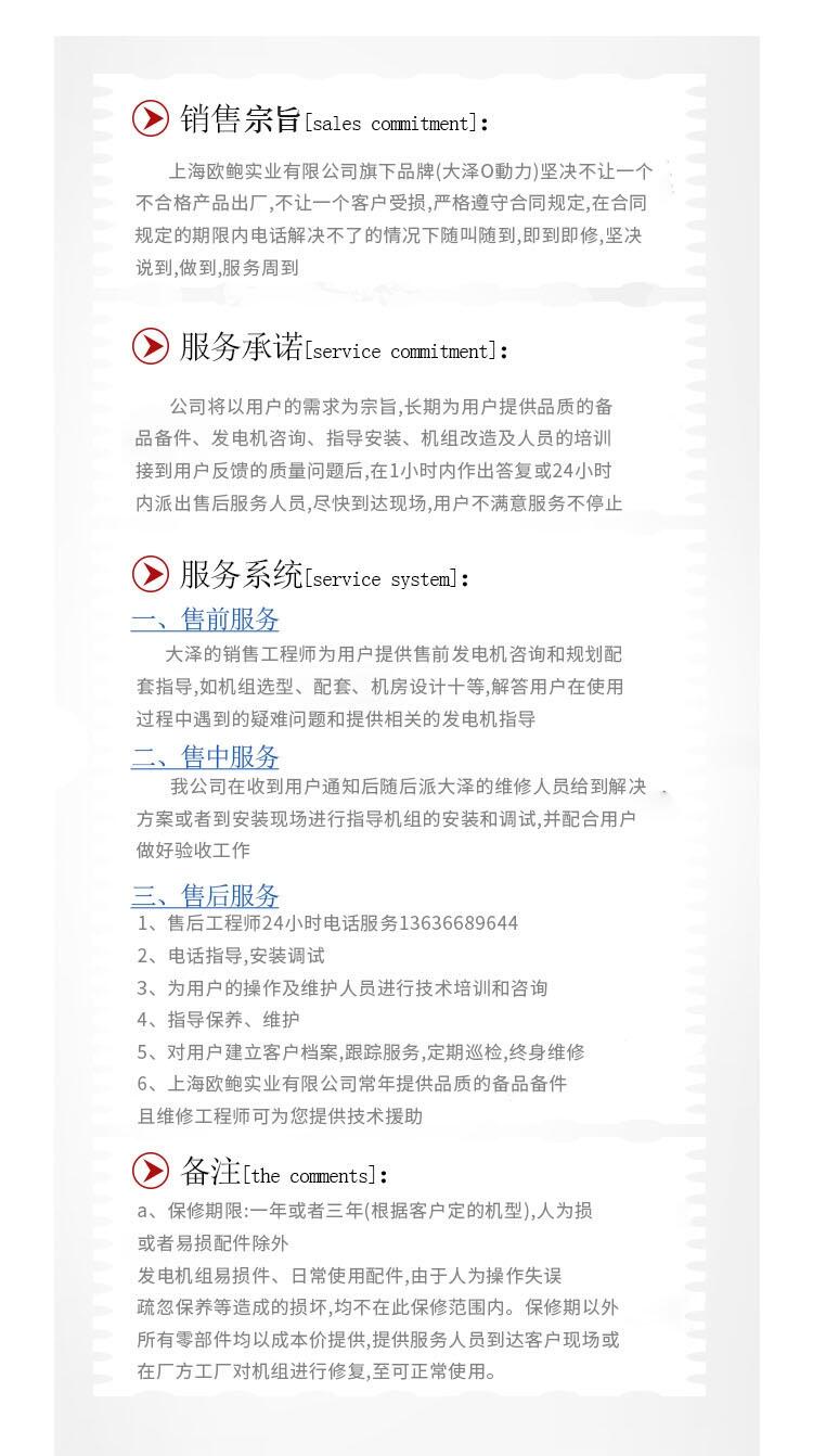 2、大泽发电机组易损件、日常使用配件,由于人为操作失误、疏忽保养等造成的损坏,均不在此保修范围内。保修期以外所有零部件均以成本价提供,提供服务人员到达客户现场或在厂方工厂对机组进行修复,至可正 常使用。