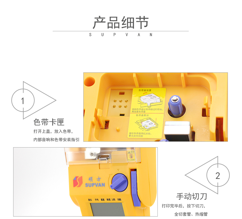 方便轻巧,便于携带,适合施工现场使用; 可安装电池,随时随地制作线缆标识; 较大的LCD显示屏,流行的蓝色背光设计; 打印的范围更大,可打印8平方的PVC套管。