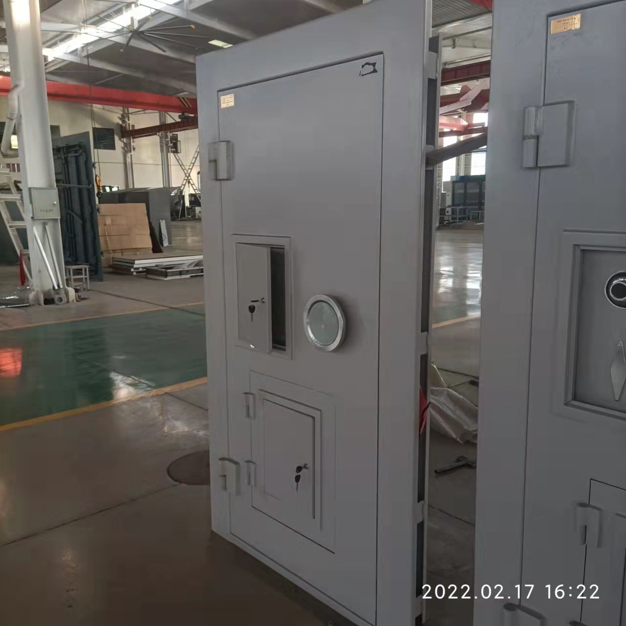 3.产品用材:库房门由8mm厚碳钢板+钢骨架+5mm厚碳钢板+复合填充层+局部20mm厚防钻合金板+3mm厚钢板组成,门框上侧与左右两侧为125mm*80mm*8mm厚不等边角钢,门框下侧200mm*40mm*8mm,框牙为3mm厚钢板组成。