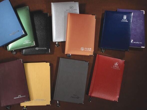 封面材质:仿皮、PU、变色PU、植绒 皮料颜色:可根据客户自选 封套工艺:可以做油边、缝线、有搭扣、无搭扣、拼接等根据客户要求制作 LOGO工艺:压印、烫金、烫银、烫蓝金等根据客户要求选择 内页用纸:80克94张米黄道林纸