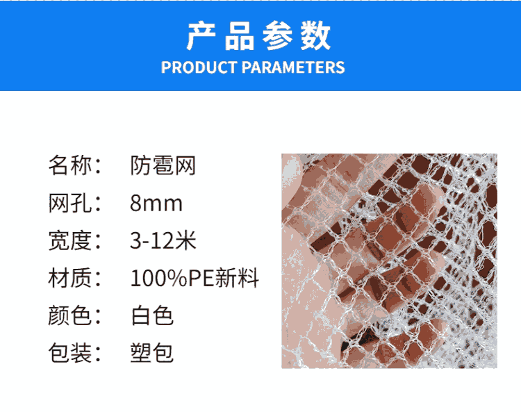 一般为聚乙烯材质,我公司生产的防雹网为100%聚乙烯全新料,不添加再生料,出口品质,从而保证了较好的使用年限。