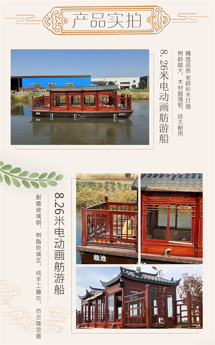 厂家批发单层画舫船电动仿古8米餐饮船玻璃钢船体观光船