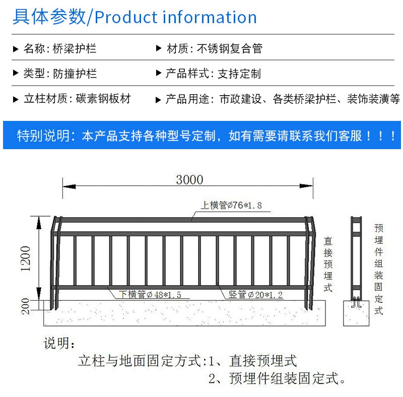 厂家桥梁景观河道防撞护栏 Q235不锈钢复合管道路防撞栏杆