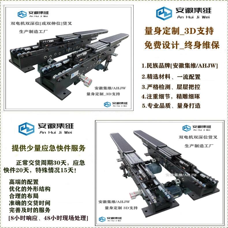 不论是单深位还是双深位,都可以采用单指式[或单列式]结构,也可以采用双指式[或双列式]结构,单指式[或单列式]结构指的是单组叉臂独立运行完成移载任务的,它适合体积比较小、重量比较轻的物料,而双指式[或双列式]结构指的是由两组叉臂组合进行同步运行的,适用于体积比较大、质量比较重的物料!