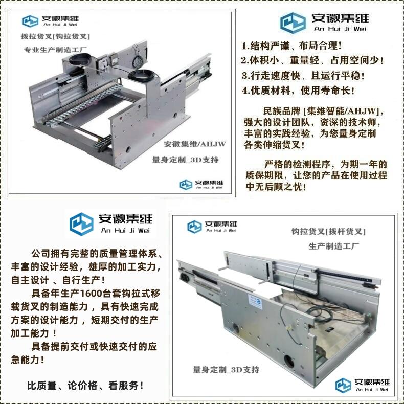 安徽集维智能装备有限公司[马鞍山市]是一家集研发、设计、生产、销售为一体的伸缩货叉[移载货叉]生产制造企业,拥有完整的质量管理体系、丰富的设计经验,雄厚的加工实力,自主设计、自行生产,具备年生产1600台套钩拉式移载货叉的制造能力,具有快速完成方案的设计能力,短期交付的生产加工能力,具备提前交付或快速交付的应急能力!