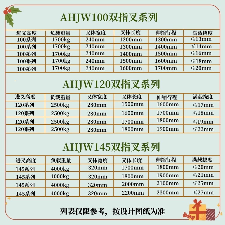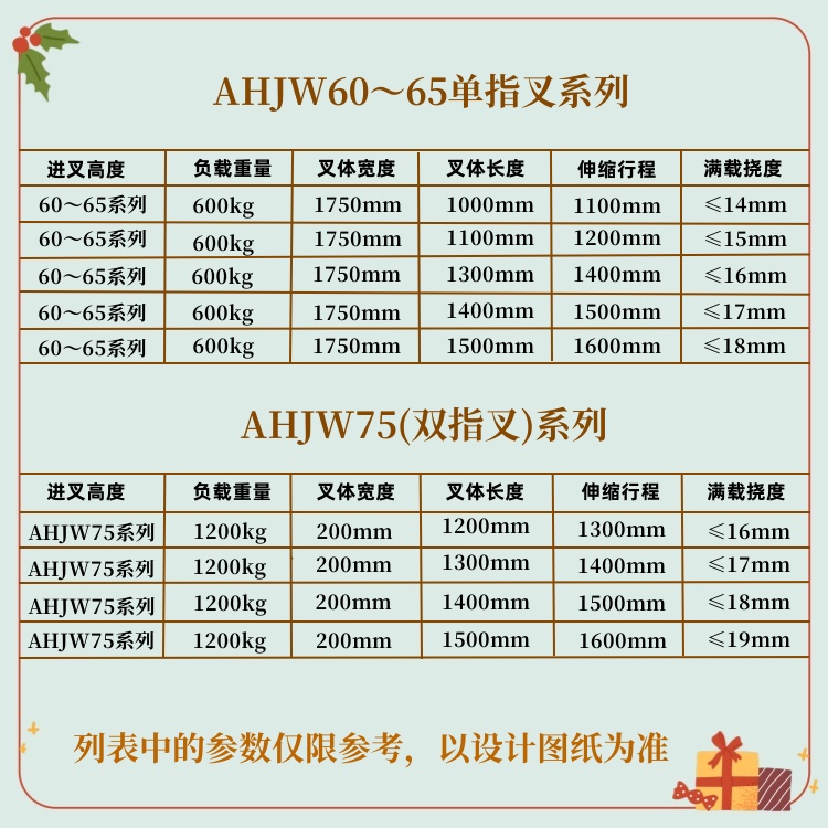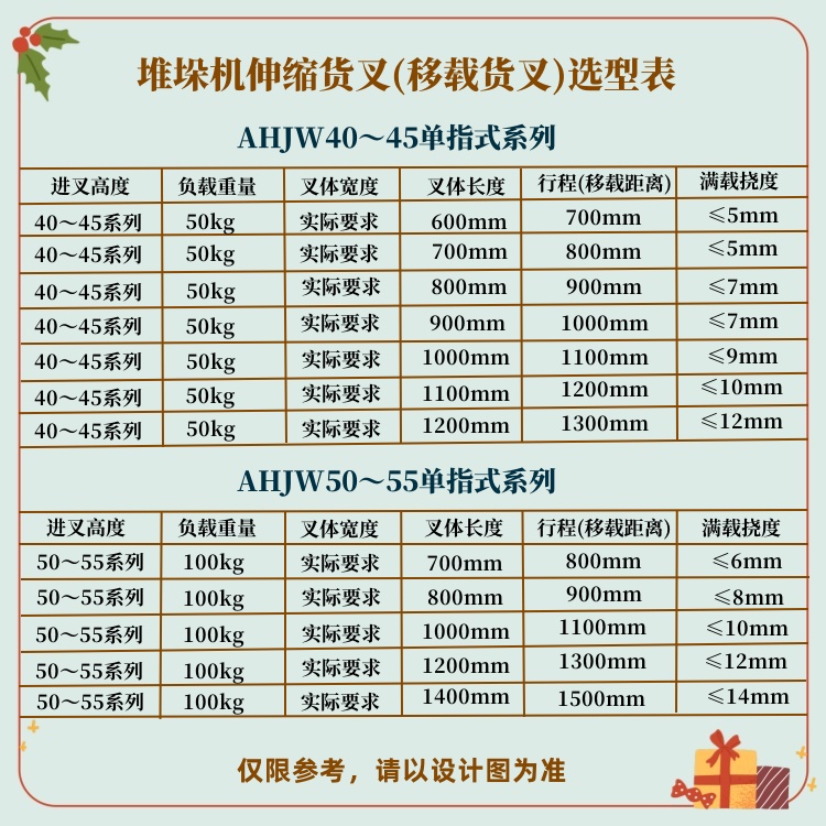 为方便用户对伸缩货叉(移载货叉)的进一步了解,我们罗列了几十种常用的、比较普遍一点的规格或型号,如:AHJW40~45系列、AHJW50~55系列、AHJW60~65系列、AHJW70系列、AHJW100系列、AHJW120系列、AHJW145系列等,选型时可作为参考,但不能以此作为实用依据(详见下列伸缩货叉选型表)!