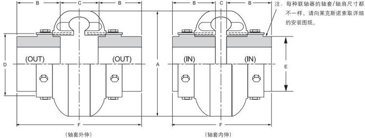 将半个莱克斯诺弹性体联轴器Omega?安装在轴套上并拧紧自锁螺栓。通过Omega?弹性体确定另外个轴套的间距,再固定那个轴套。
