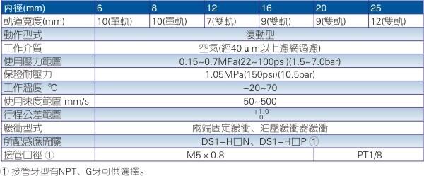 1.缸径:6、8、12、16、20、25等可选。每种缸径分别对应多种规格行程,方便选用。 | ||||||||