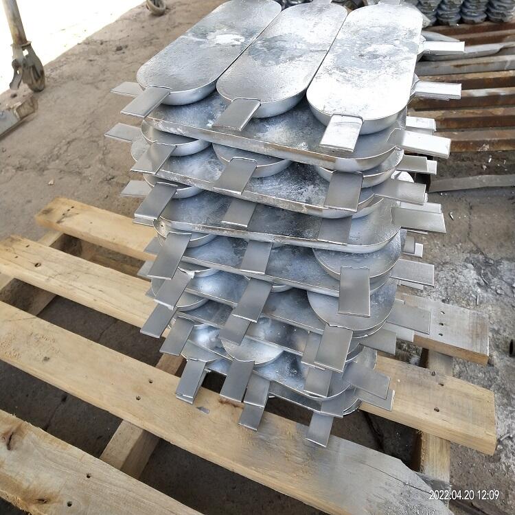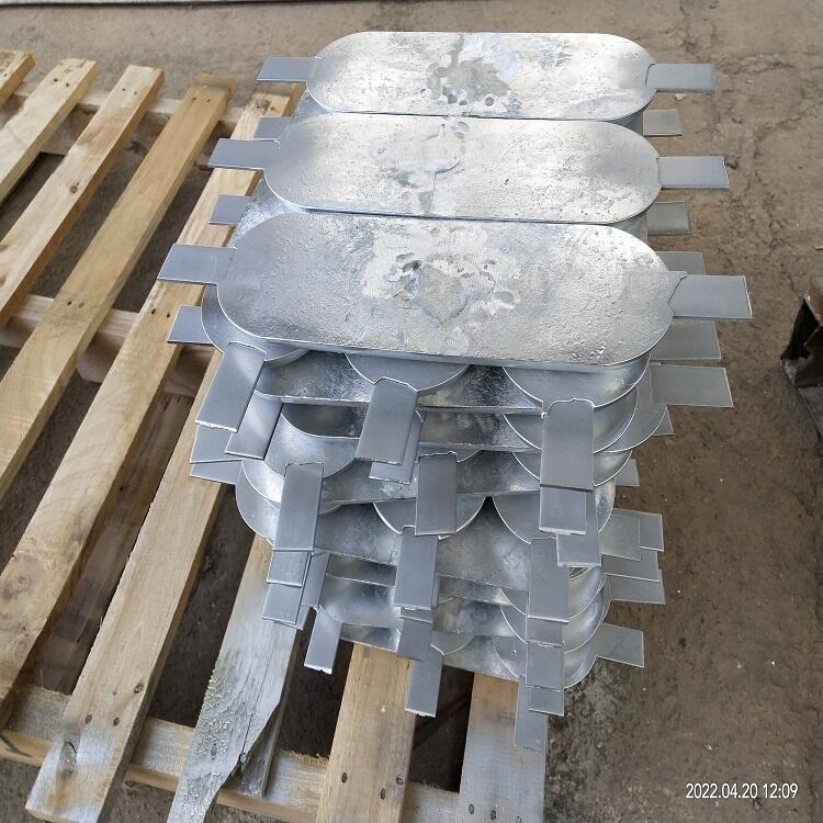 锌也可做成镯式阳极,主要应用在水下和海底管道上,一种是作成块状然后焊接在钢支架上形成一个圆形,还有直接做成半环状,直接扣在管道上。