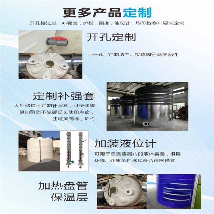 塑料水箱的工艺形成塑料储罐以纯聚乙烯(线性低密度聚乙烯LLDPE、高密度聚乙烯HDPE)为原料,采用滚塑工艺整体成型。具有无焊接、不渗漏、重量轻、抗老化、抗冲击、寿命长等优点。一体成型整体性、长寿命优点尤为突出。产品具有检测报告,及卫生配件与传统防腐储罐相比,低廉,