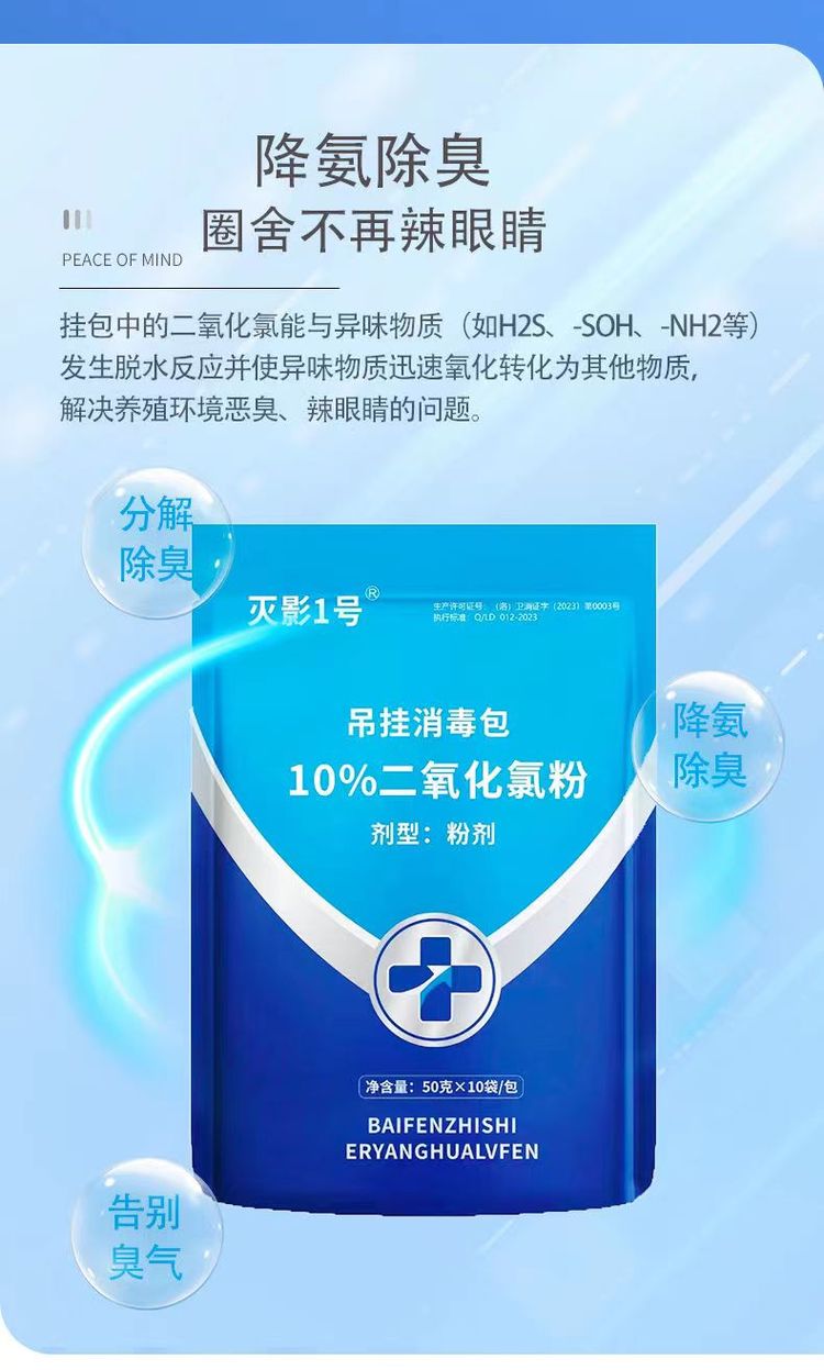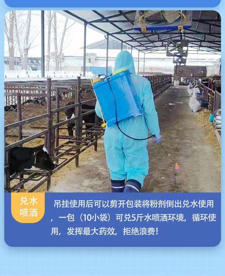 使用方法非常简单,只需挂在养殖场的合适位置,就能持续发挥作用。吊挂使用后可以剪开包装将粉剂倒出兑水使用,一包(10小袋)可兑水5斤,喷洒环境,循环使用,发挥最大药效,拒绝浪费。让您轻松管理养殖场,确保动物健康生长。