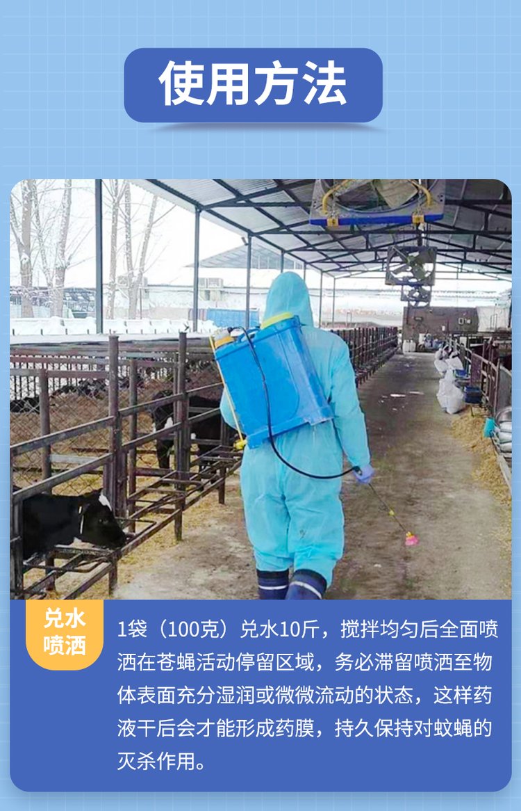 6、喷药量以物体外表湿而不流为佳。 家庭、宾馆、学校、宿舍、厕所、军营、商店、餐厅、食品厂、饲养场、垃圾堆等场所。