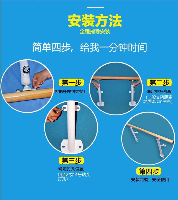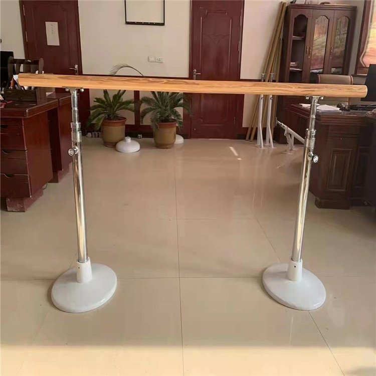 把杆材质:天然实木,把杆Φ55cm,内有Φ22cm弹簧钢。长度规格:1-4米现货(其他尺寸可定制)支架升降高度:80-120cm(可调节)适用范围:舞蹈室、舞蹈房、舞蹈排练厅、家庭、单位表面:把杆光滑无毛刺,手感舒适表面聚脂清漆处理。现在用的较多的舞蹈把杆一般是水曲柳木,内衬弹簧钢加工而成的。为什么选用水曲柳木,因为水曲柳木质地坚硬,不容易变形,耐用。再加上弹簧钢的特性,一套标准的水曲柳木把杆用几年都不会出现,变形等问题