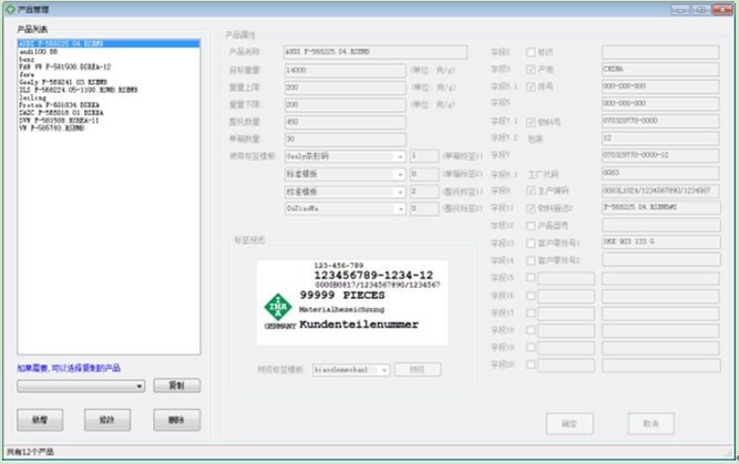 2. 利用产品管理功能创建新的产品,并设置好其相关的生产参数及选用的标签模板,还有填好模板中关联变量的值