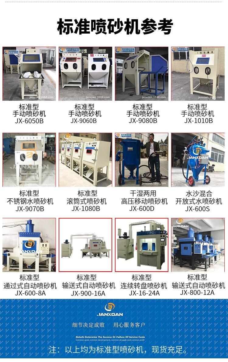 2.要看产品的形状,选择喷砂机的规格,一般一米以下的都有固定的规格,特别大的要订做或选择开放式的。