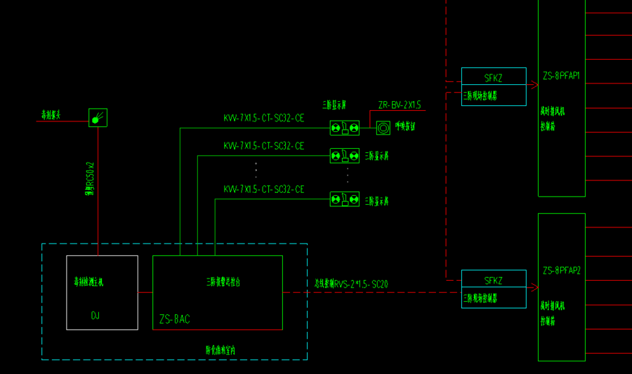 三防总控制台和三防显示屏,人防音响警报接收设备配套使用。采用PLC可编程控制器程序输出三种通风方式信号以及地下人防的风机风阀开闭控制及反馈,显示屏采用LED分别显示三种通风状态,该设备还可接受毒剂报警主机,人防空气质量检测仪,空气放射性检测仪的信号。