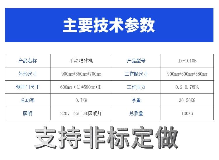 2.要看产品的形状,选择喷砂机的规格,一般一米以下的都有固定的规格,特别大的要订做或选择开放式的。